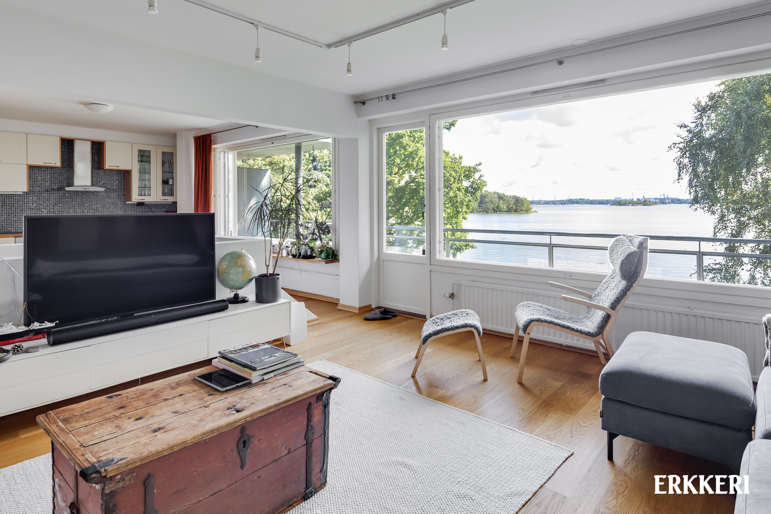 Tässä kodissa yhdistyvät merellisyys, tilantuntu ja rauha. Iso olohuone, keittiö ja ruokasali muodostavat näyttävän ja avaran kokonaisuuden, josta avautuvat suuret ikkunat merelle. Asunnon levyinen lasitettu terassiparveke ja toinen parveke tuovat valoa ja yhteyden ympäröivään maisemaan. Tyylikäs takka viimeistelee olohuoneen tunnelman.