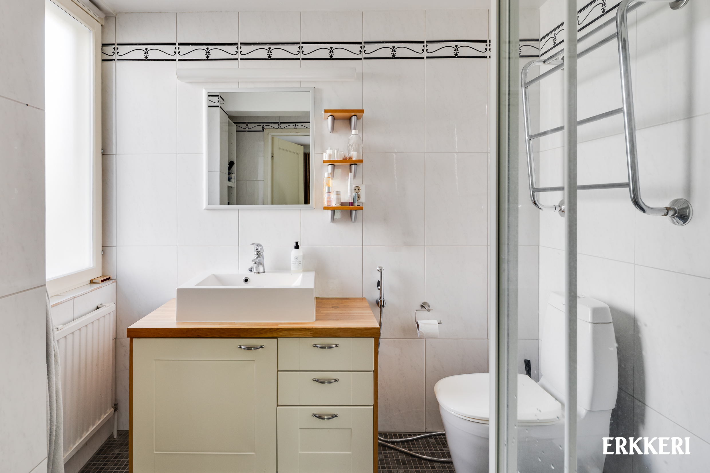 Päämakuuhuoneessa on oma kylpyhuone, ja kahta muuta makuuhuonetta palvelee toinen kylpyhuone, jossa toimii myös pyykkihuolto. Huoneiston aputiloina ovat alakerran kaksi noin 13 m² varastohuonetta, jotka soveltuvat hyvin esimerkiksi työ- tai harrastetiloiksi. Asuntoon kuuluu lisäksi tilava lämmin häkkivarasto sekä iso, noin 25 m² autotalli.