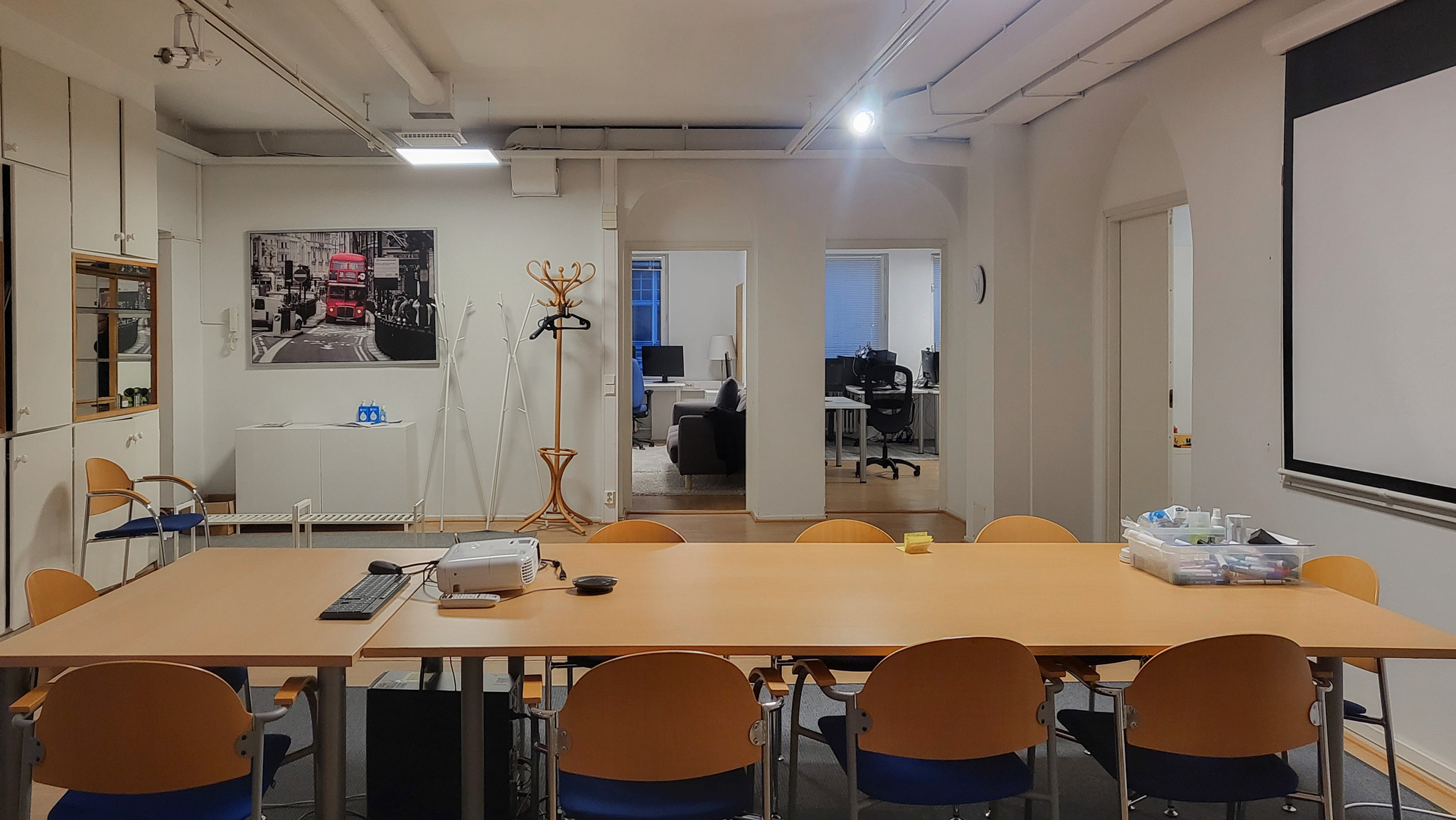 167 m² avara toimisto, missä isompia huoneita neuvotteluja varten ja pienempiä huoneita tarkkuutta vaativaan