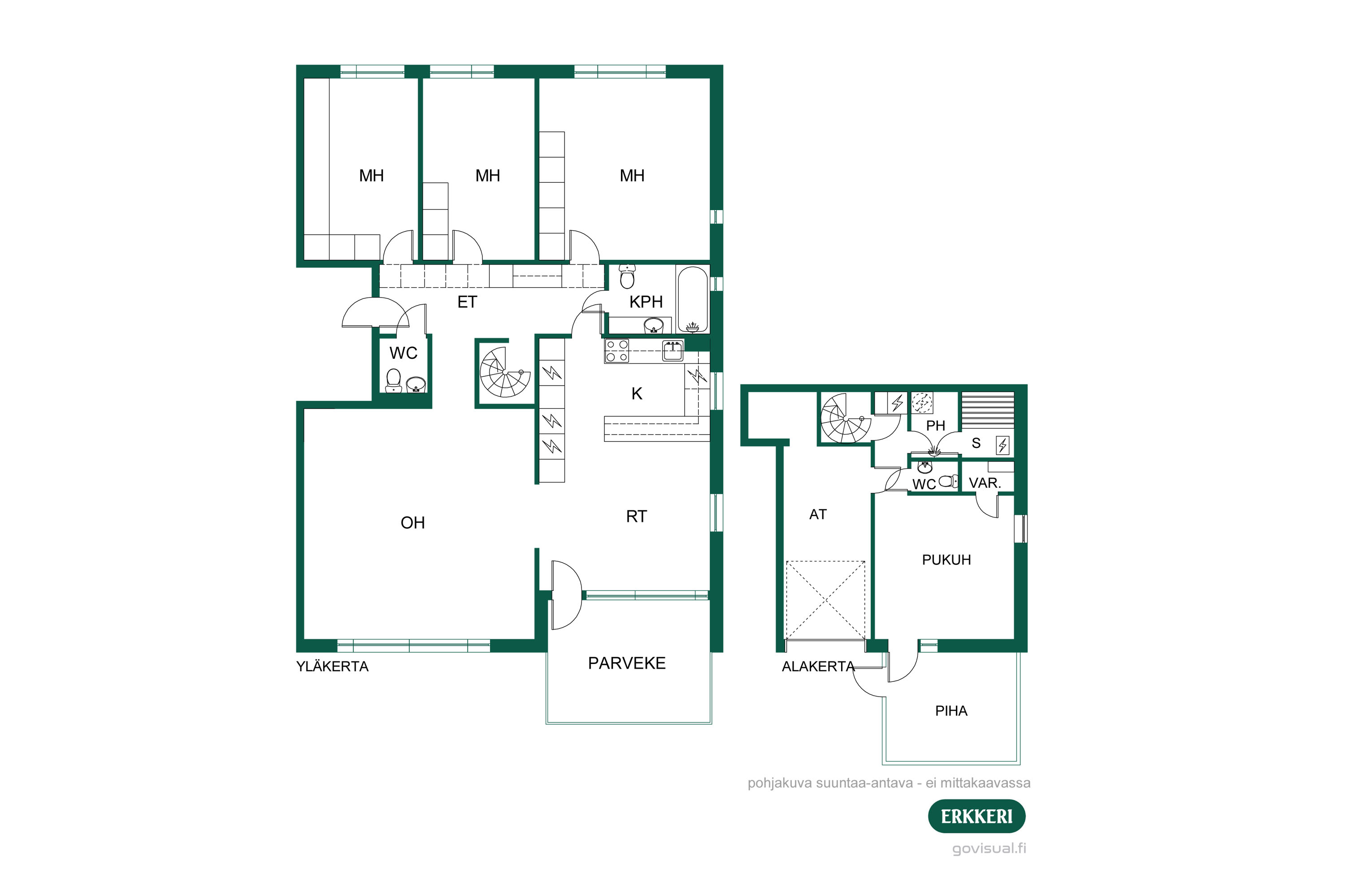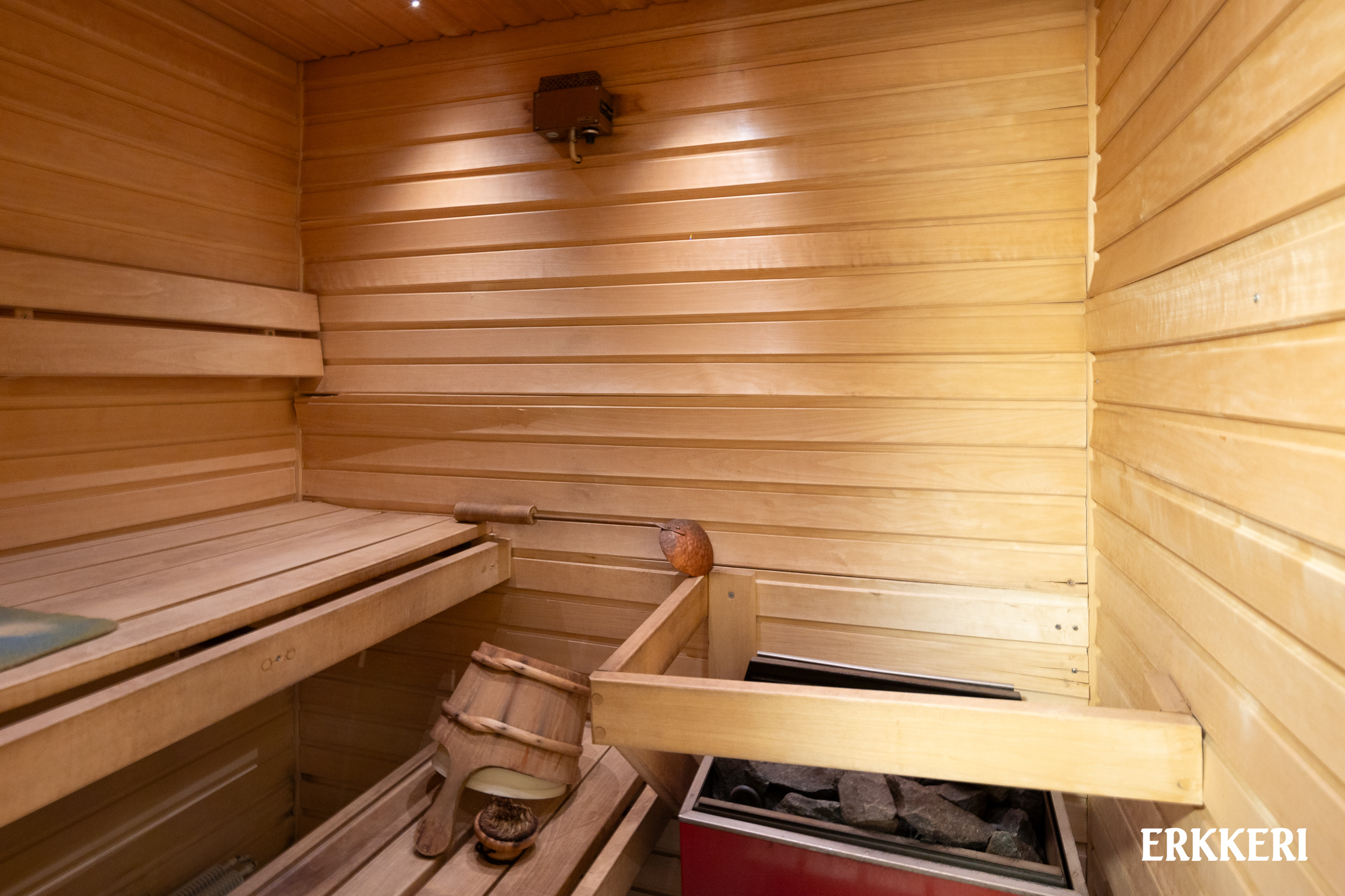 Alakerrasta löytyy monikäyttöinen huone, joka sopii esimerkiksi työ- tai vierashuoneeksi. Lisäksi sauna, pyykkitilat ja patio tarjoavat arkeen lisämukavuutta. Autotalli tuo helppoutta pysäköintiin ja lisää säilytystilaa.