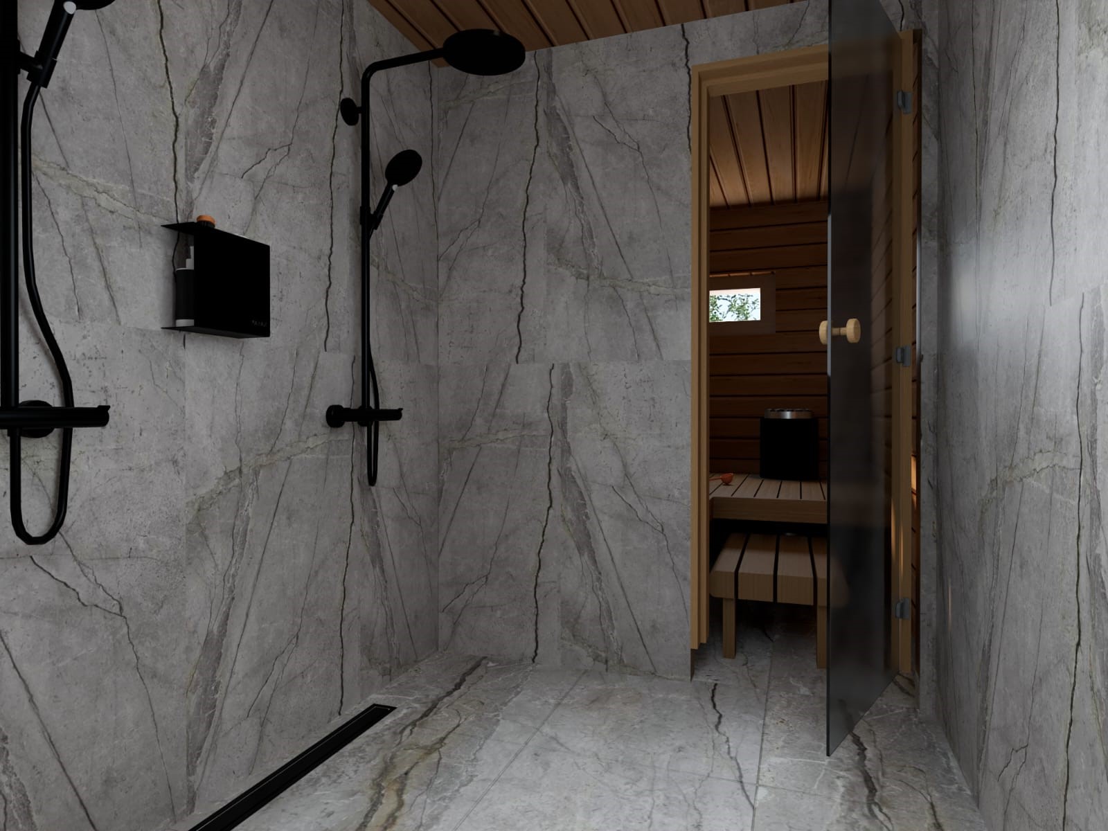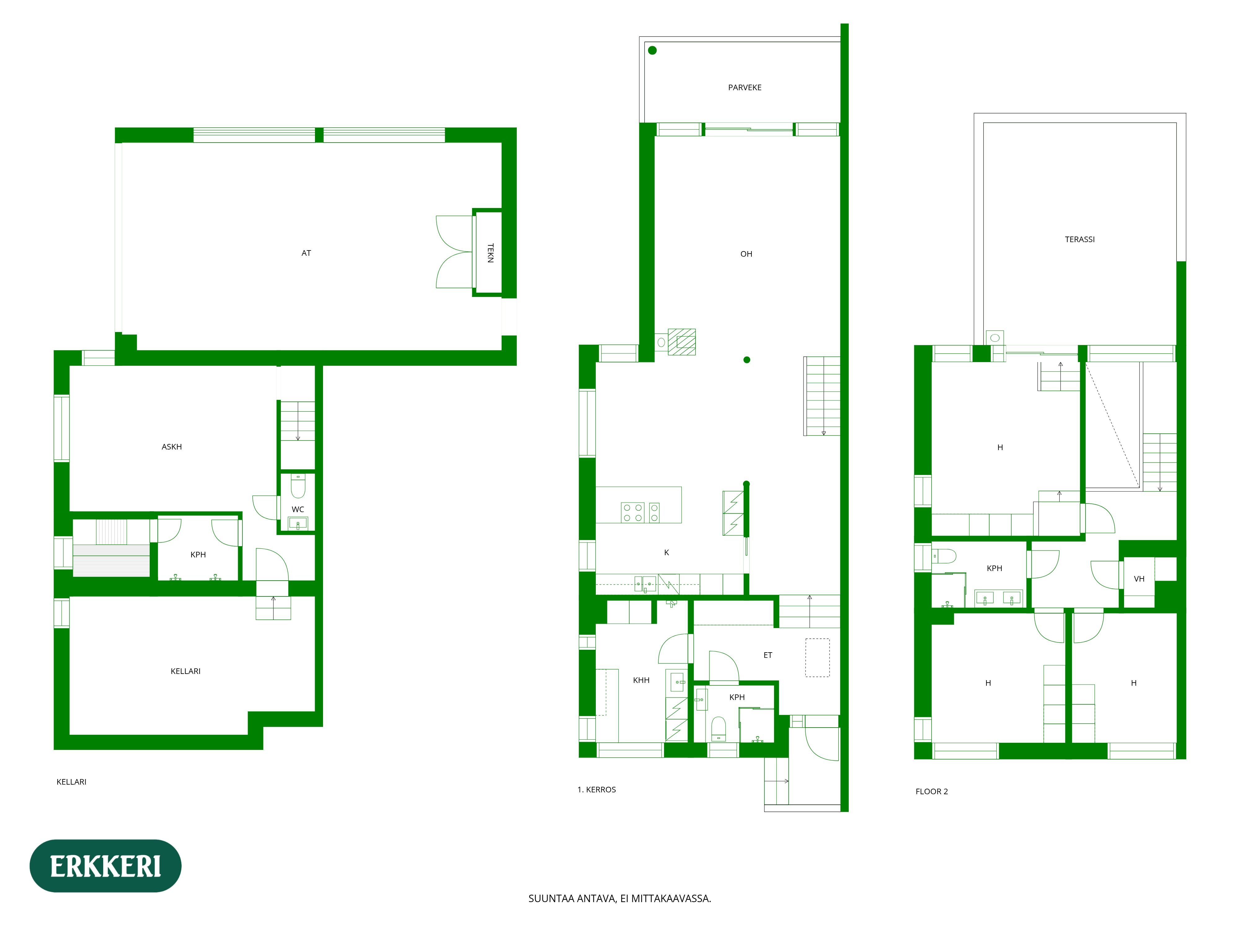 Huoneisto jakautuu kolmeen kerrokseen. Sisääntulokerroksessa avara keittiö, ruokasali ja olohuone muodostavat yhtenäisen kokonaisuuden. Lisäksi kerroksessa on kodinhoitohuone sekä erillinen wc / suihku. Yläkerrassa sijaitsee kolme makuuhuonetta ja kylpyhuone jossa myös WC. Alakerrasta löytyvät edustavat sauna- ja oleskelutilat, runsaasti varasto- ja aputiloja sekä kahden auton autosuoja.
