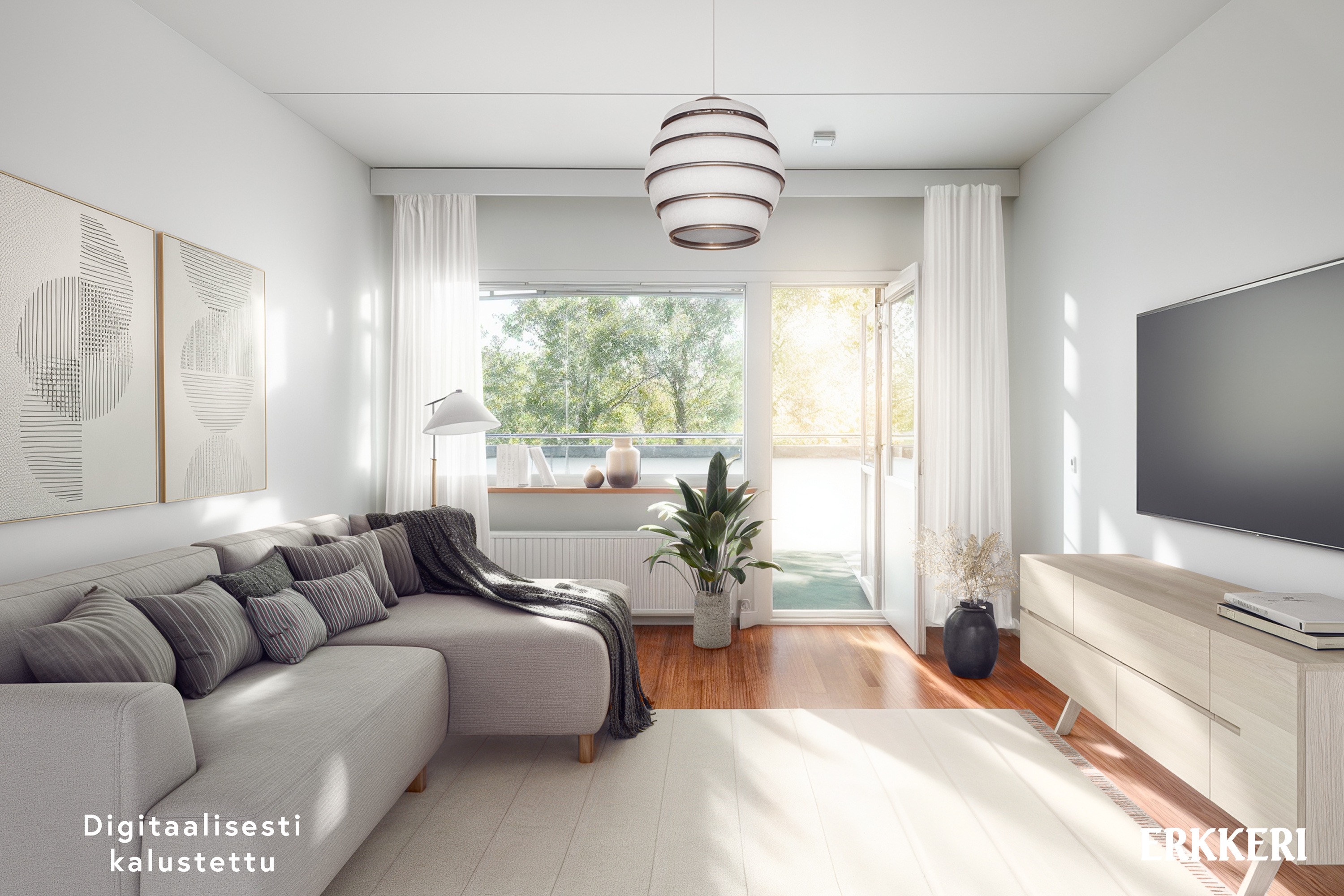Huoneet ovat tilavia ja helposti kalustettavia, mikä tekee kodin sisustamisesta vaivatonta. Olohuoneesta avautuu kulku suurelle lasitetulle länsiparvekkeelle, joka toimii viihtyisänä lisähuoneena pitkälle syksyyn.