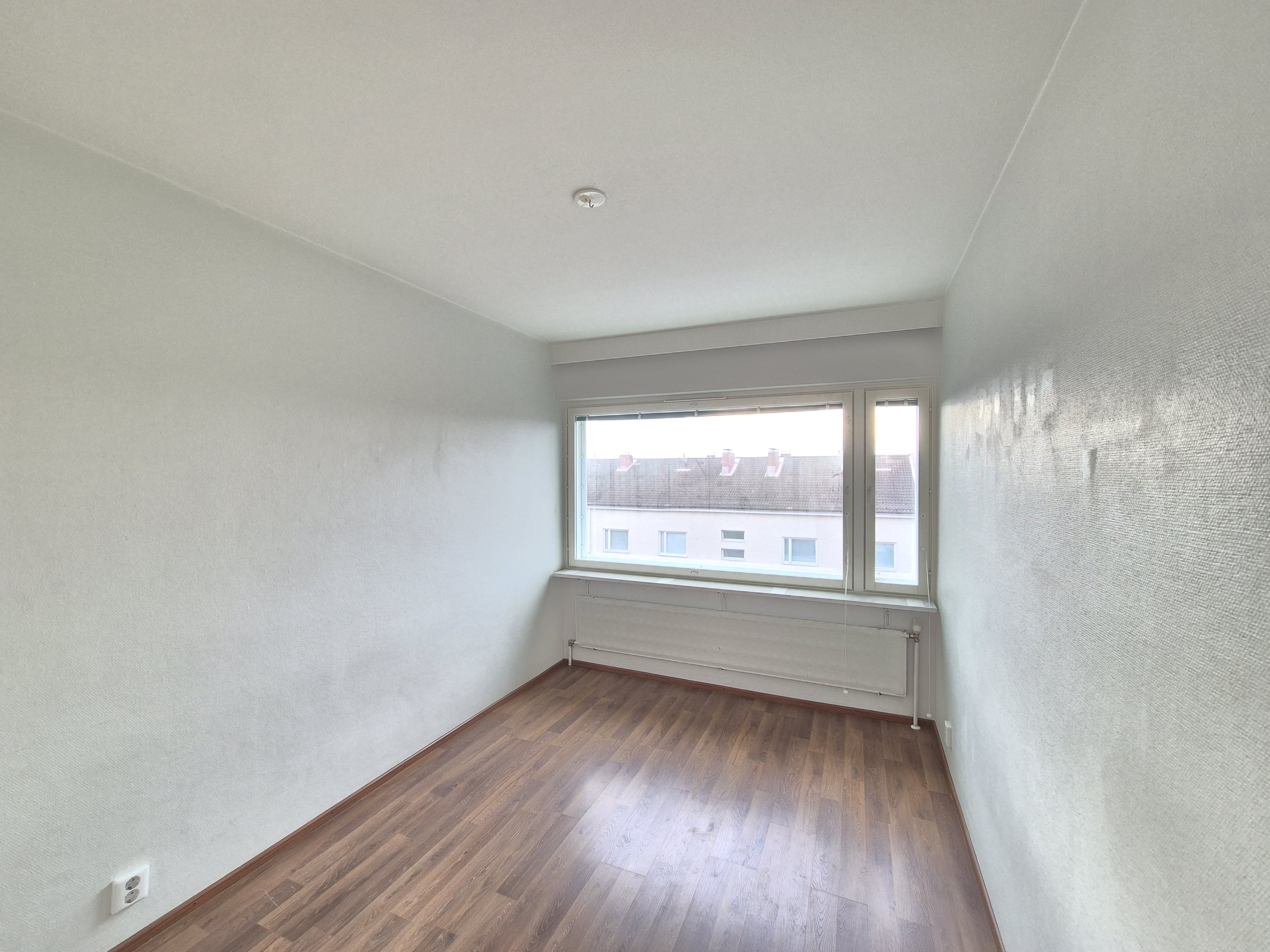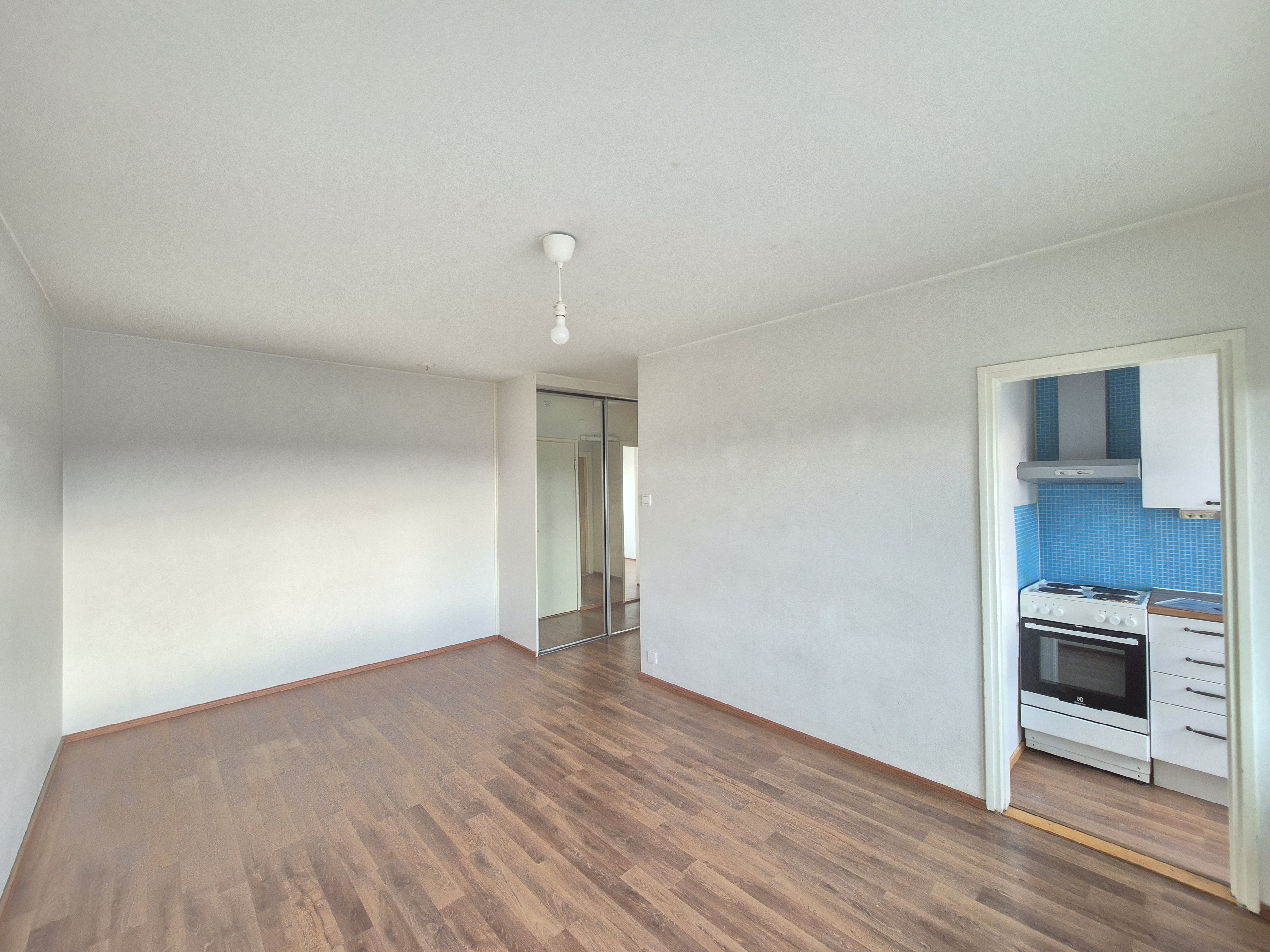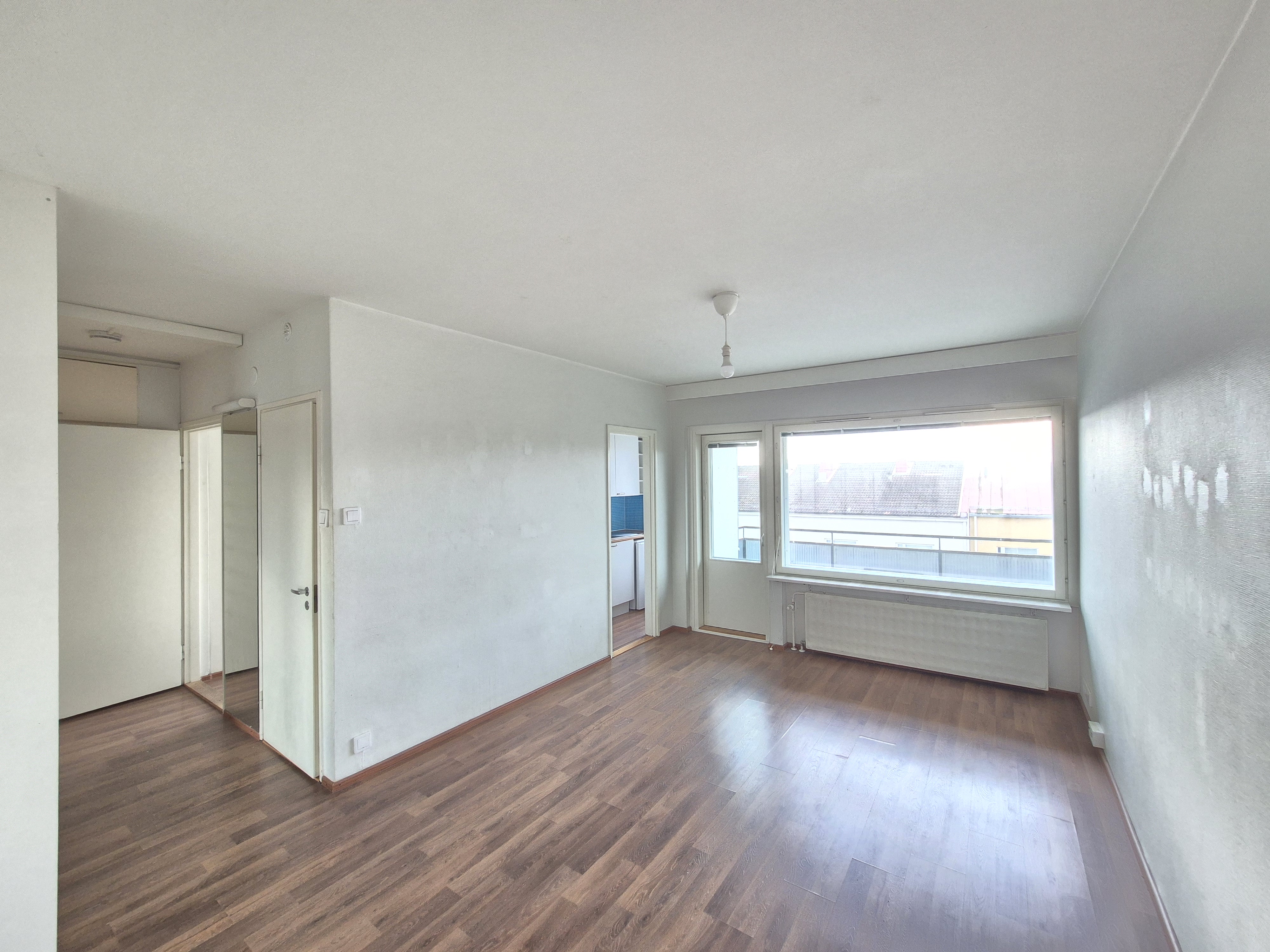 4. kerroksen kompakti kaksio. Yllättävän isot asuinnhuoneet sekä runsaasti säilytystilaa eteisessä sekä makuuhuoneessa. Pieni ikkunallinen keittokomero olohuoneen yhteydessä. Olohuoneesta myös kulku parvekkeelle. Vuonna 2015 uusittu pieni kylpyhuone. Huoneisto on tyydyttävässä kunnossa.