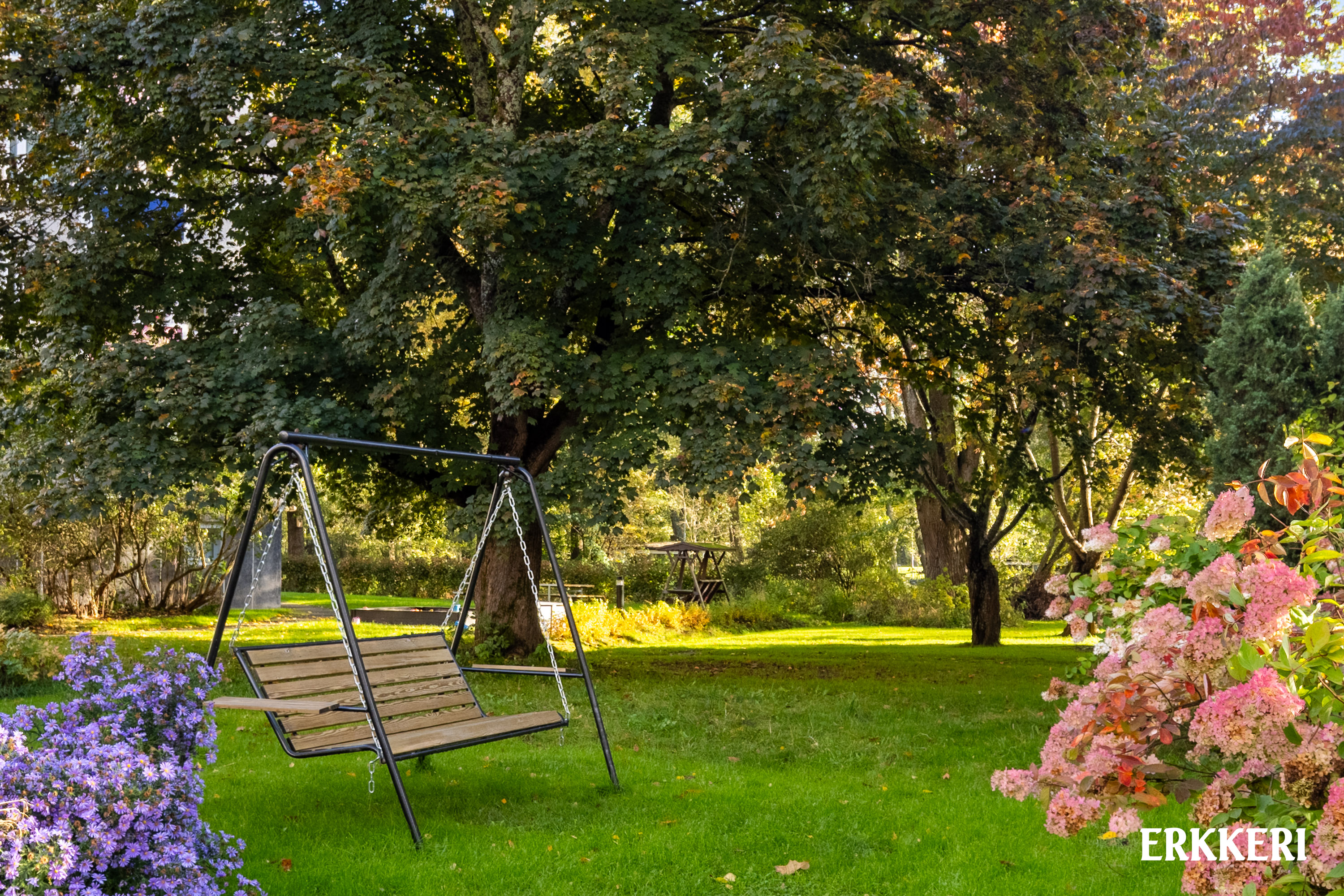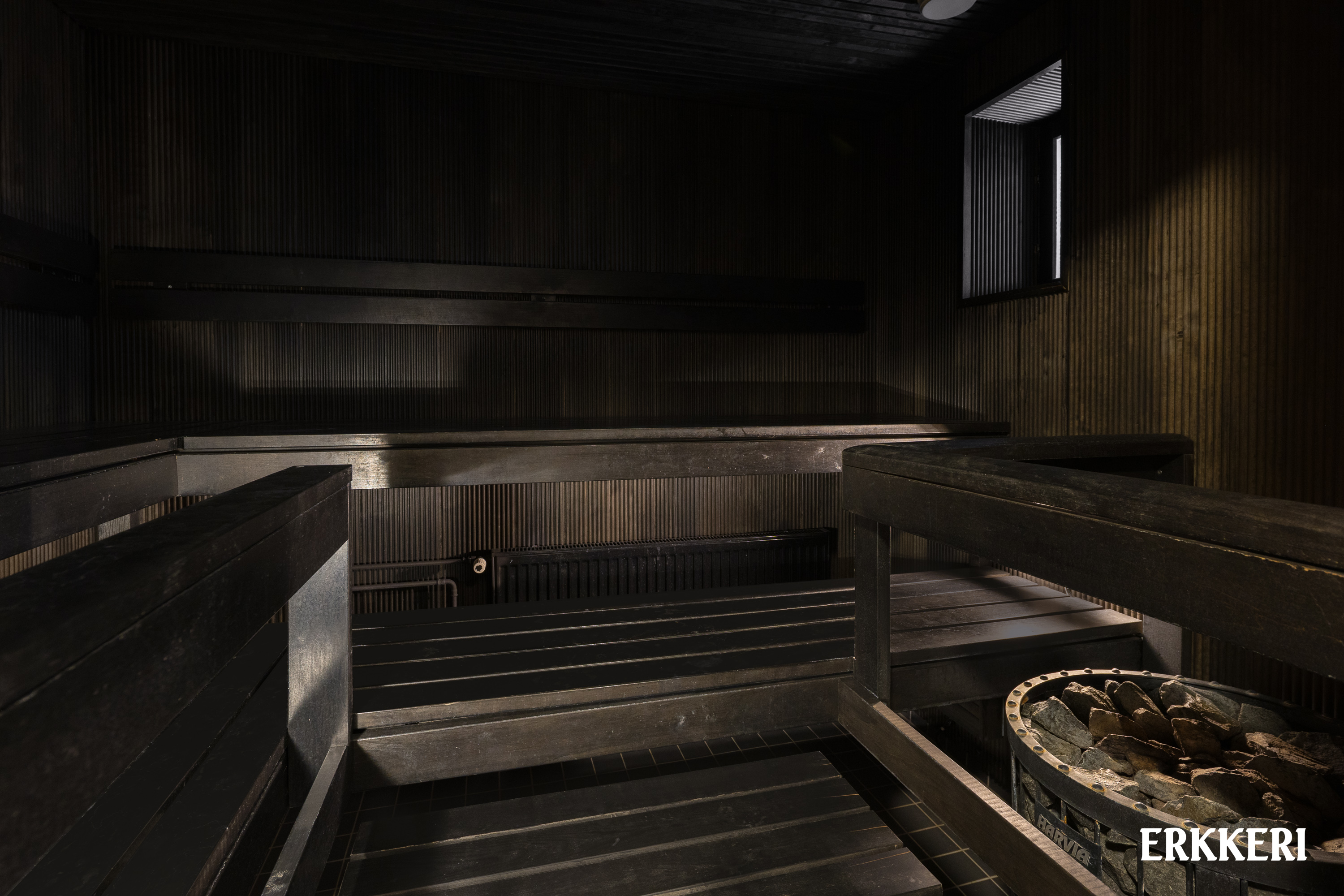 Yhteiset tilat: Upeat saunatilat tehty LVIS-saneerauksen myötä sekä viihtyisä, aurinkoinen viherpiha.