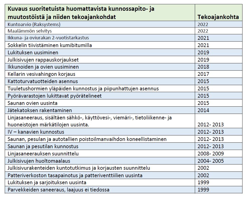 | Tulevat remontit | Ei päätetty / tiedossa remontteja, jotka oleellisesti vaikuttaisivat asumiseen lähitulevaisuudessa. 2025: Palovaroittimet, salaojien peruskorjaus, pihan asfaltointi. 2026: Saunan lauteet ja seinät. 2027: Lämmityksen perussäätö, patteriventtiilien uusiminen, porrashuoneiden kunnostus (sis. kerrostaso-ovet). 2028: Betonimuurien kunnostus molemmissa taloissa. 2029: Valurautaisten putkien kuvaus. |