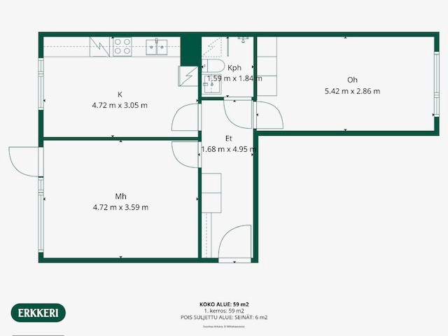 Huoneisto sijaitsee hissitalon 5.kerroksessa. Keittiössä hyvin säilytys- ja laskutilaa ja mukava kokkailla, toki myös astianpesukone on. Keittiöstä ikkunanäkymä taloyhtiön sisäpihalle. Kylpyhuone on uusittu taloyhtiön linjasaneerauksen yhteydessä ja on nykyaikainen. Eteisessä sekä makuuhuoneessa hyvin säilytystilaa. Asunto on tilava ja saat kalustettua siitä helposti mieleisen.