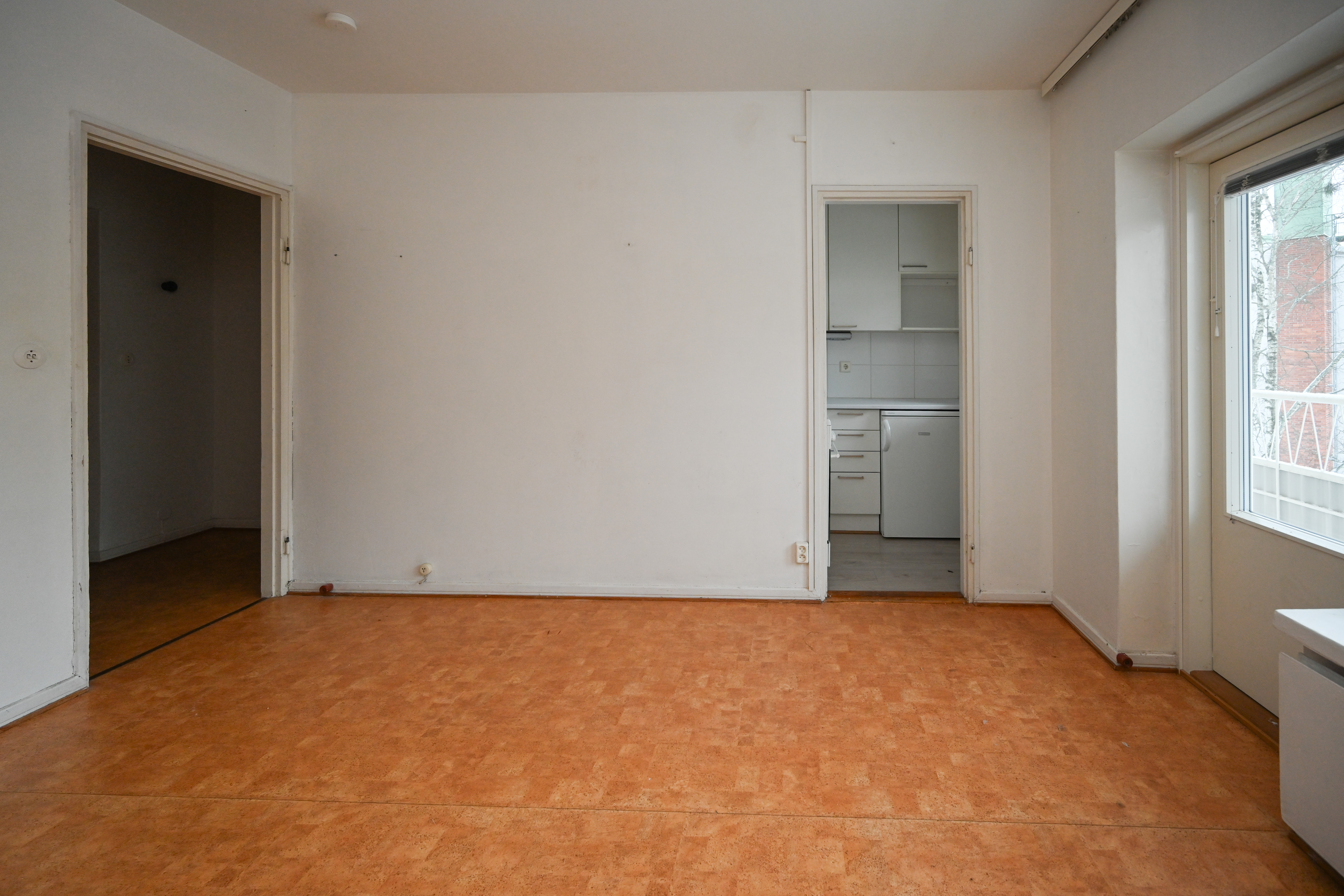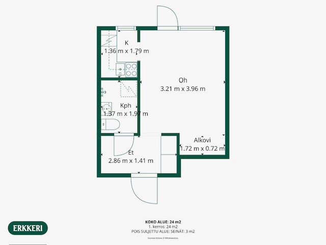Alkovi rajaa sängyn luontevasti muusta oleskelutilasta ja tekee asunnosta helposti kalustettavan. Ikkunallinen keittokomero tuo valoa ja käytännöllisyyttä arkeen. Kylpyhuoneessa on liitäntä pyykinpesukoneelle.