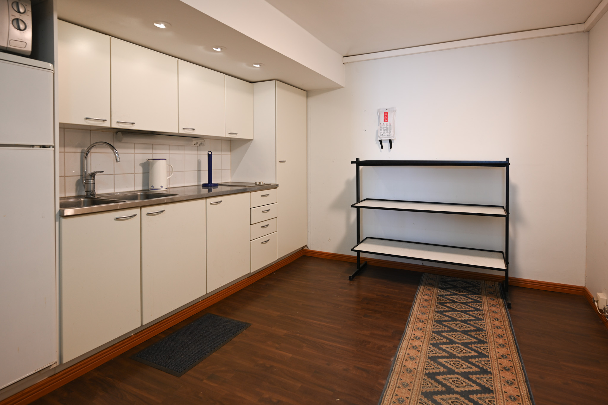 Tilassa on toimiva pohjaratkaisu: kolme kerrosta jakavat toiminnot selkeästi, ja alakerrassa sijaitseva kassaholvi tuo lisäturvaa arvotavaran säilytykseen. Käytännöllisyyttä lisäävät oma keittiö ja kylpyhuone, jotka tuovat arkeen mukavuutta ja toimivuutta.