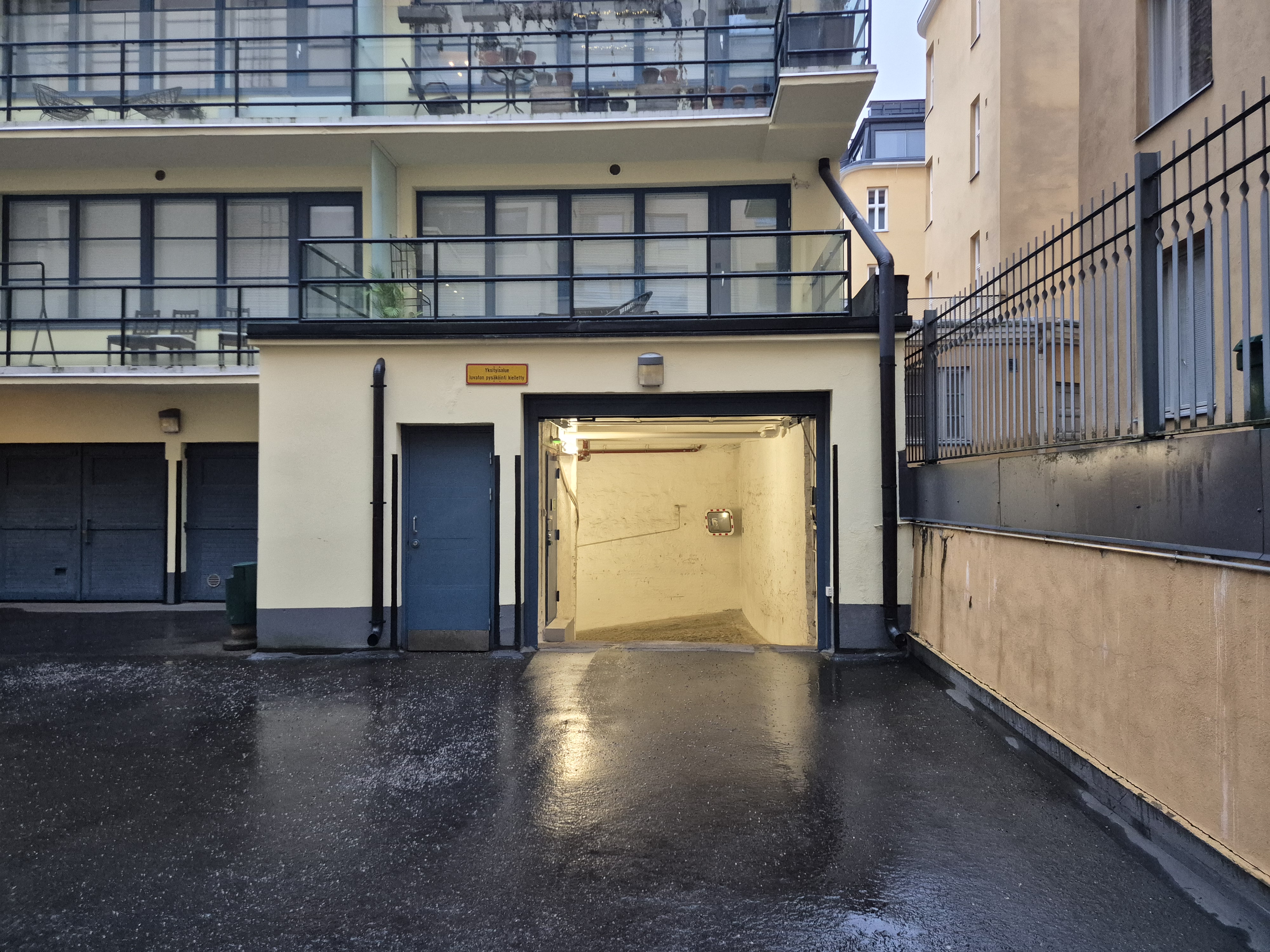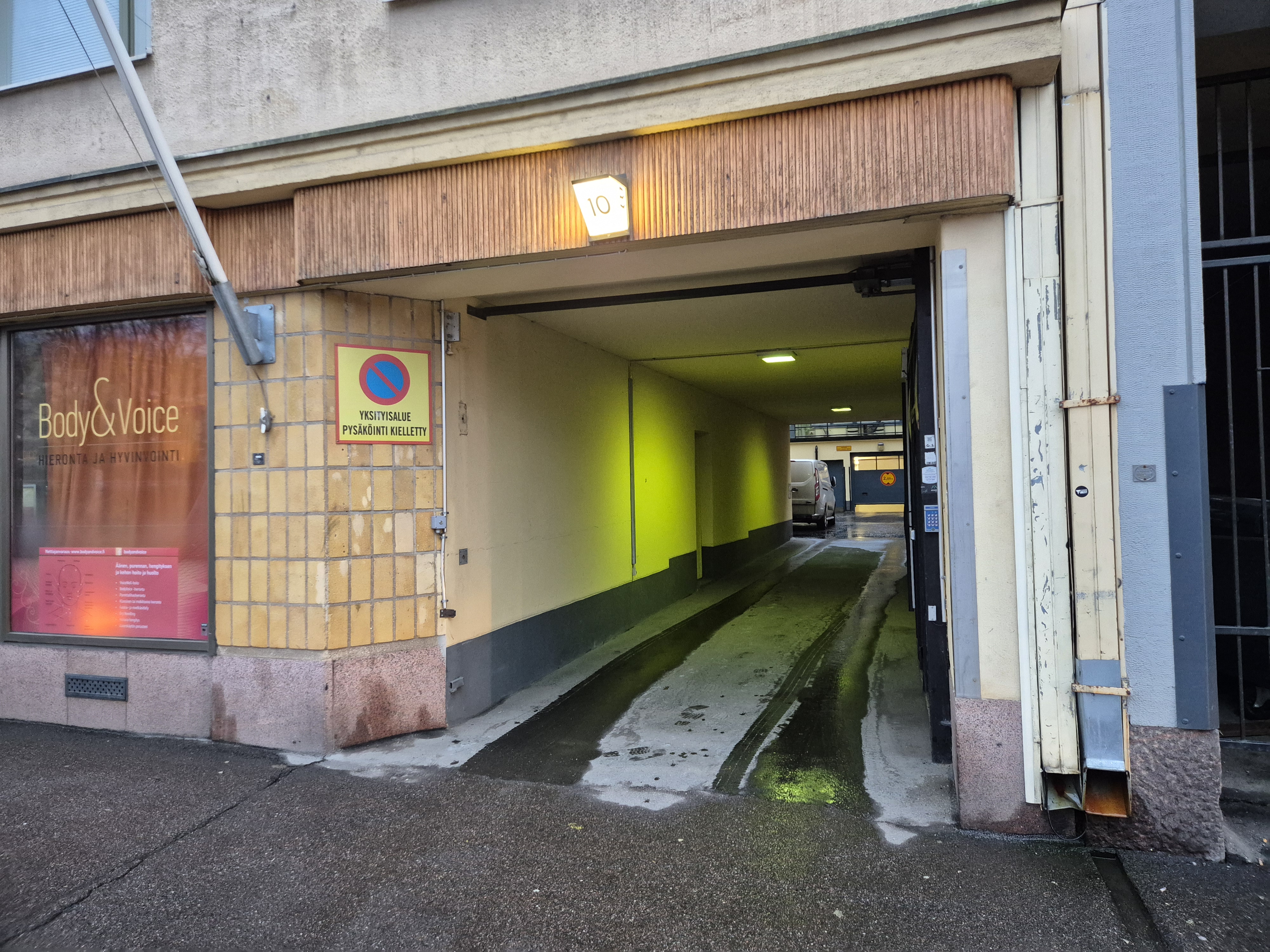 Ajo autohalliin Ruoholahdenkadulta porttikongin kautta, sisäpihalla nosto-ovi autohalliin. Sekä porttiin että nosto-oveen sama kaukosäädin.