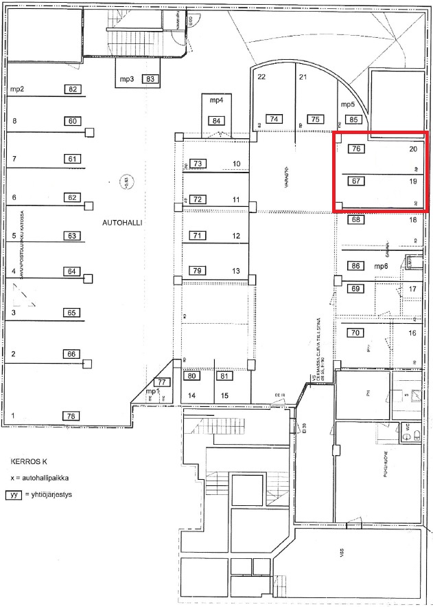 Poikkeuksellisen suuri autopaikka asuinkerrostalon alapuolella. Autopaikka koostuu virallisesti autopaikoista numero 19 ja 20. Paikan pituus n. 560 cm ja leveys n. 455 cm. Paikassa ei ole sähköauton latausmahdollisuutta.