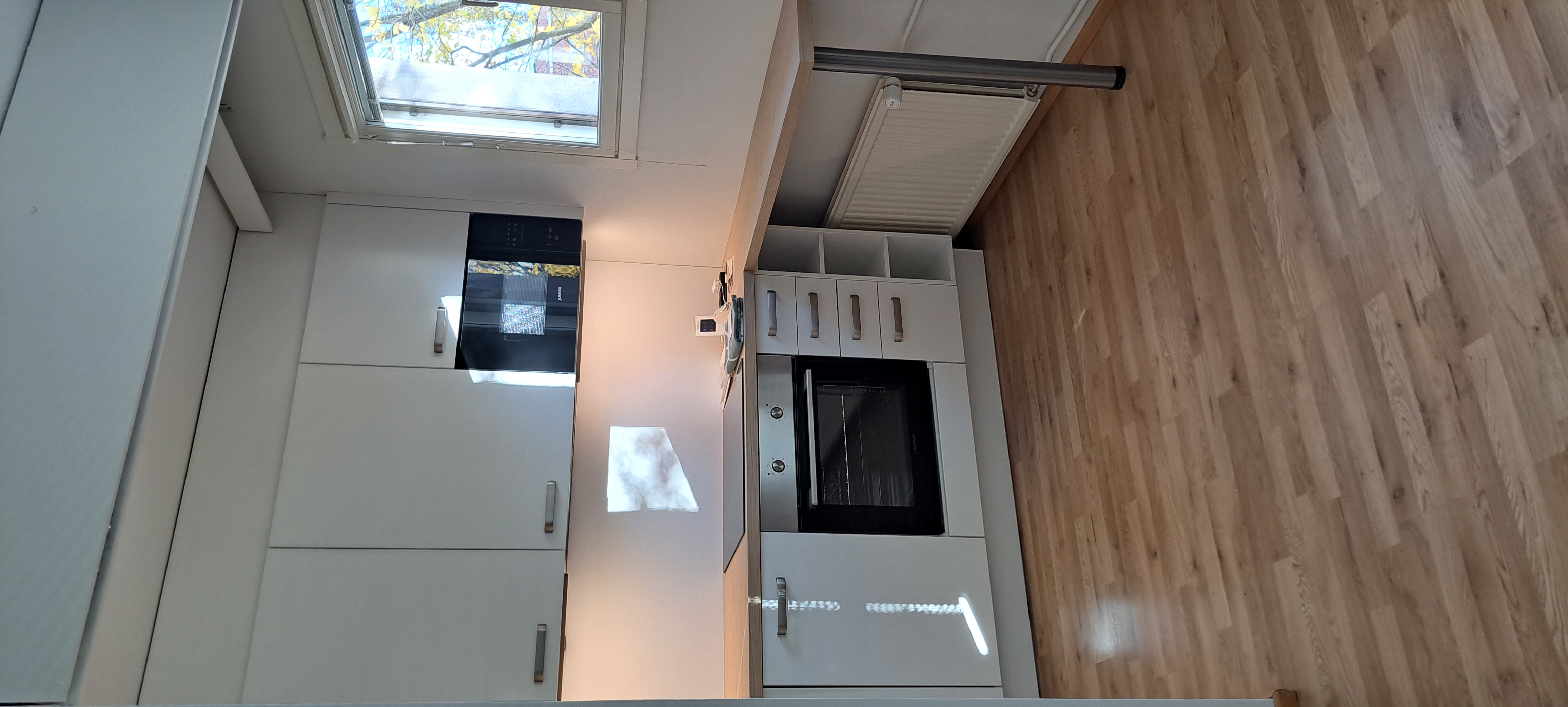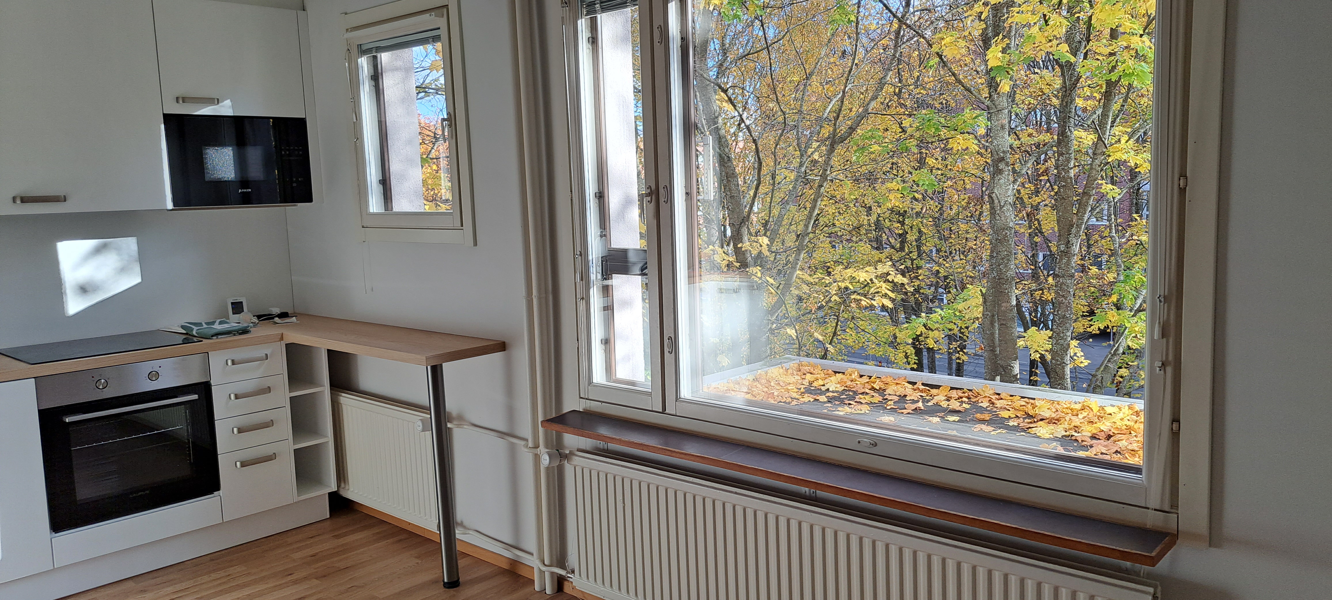 Asunto on juuri remontoitu, ja sen keittiö on täysin uusittu – varustettuna keraamisella liedellä, astianpesukoneella ja jääkaappi-pakastimella.