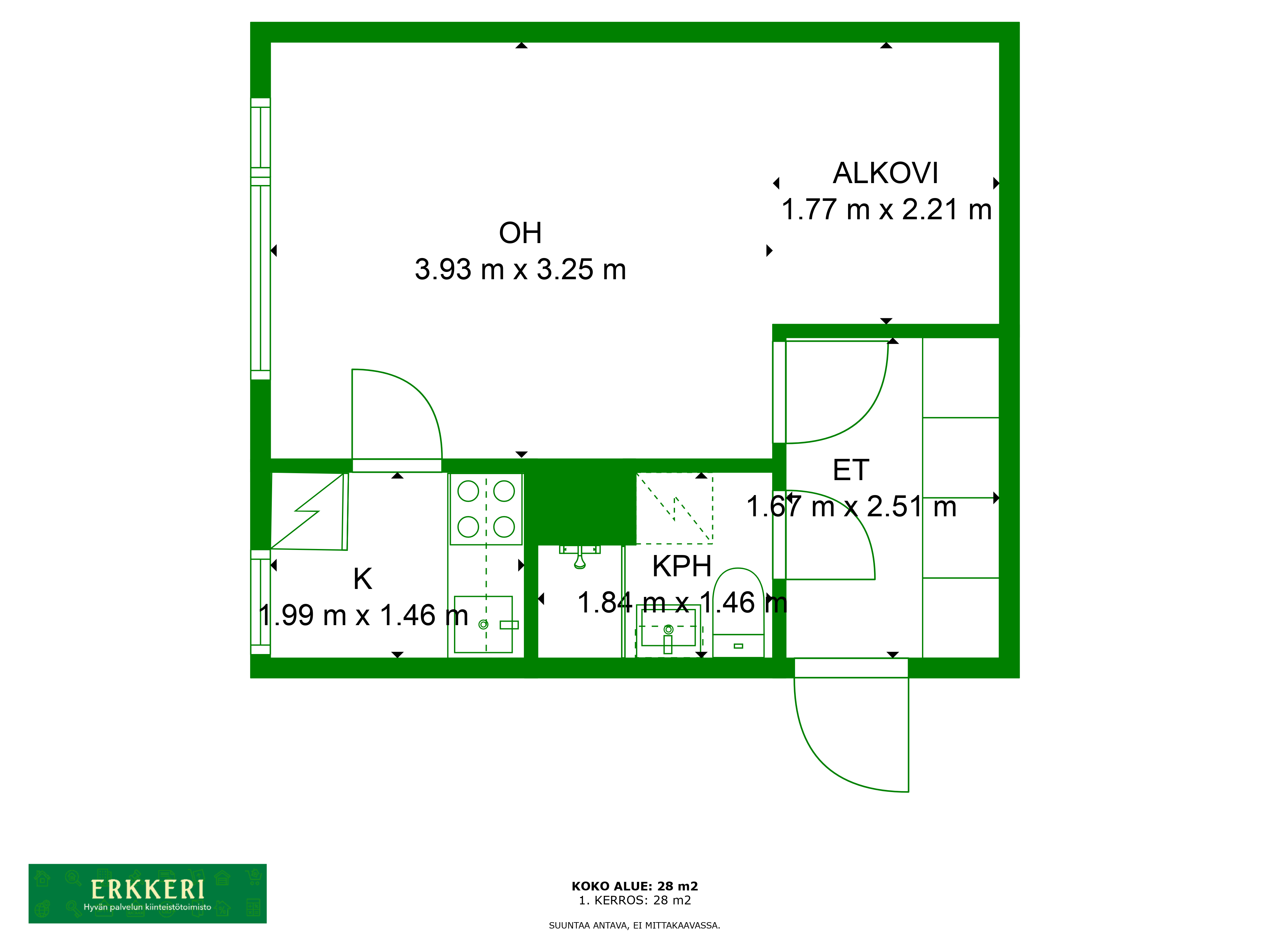 Asunnossa hyvä ja selkeä pohjaratkaisu. Tilava alkovi mihin saan sängyn ja näin muulle kalustukselle jää hyvin tilaa. Ikkunallinen keittokomero. Kylpyhuoneessa paikka pyykinpesukoneelle.