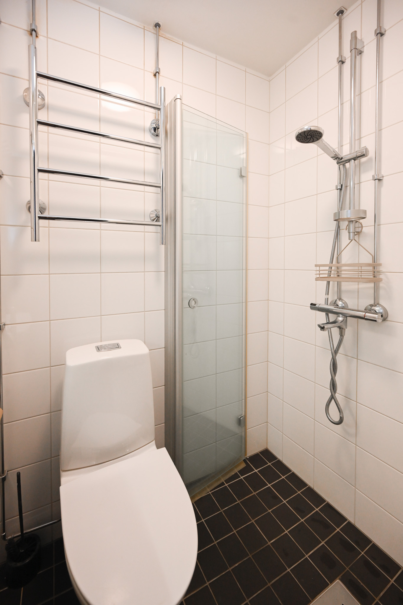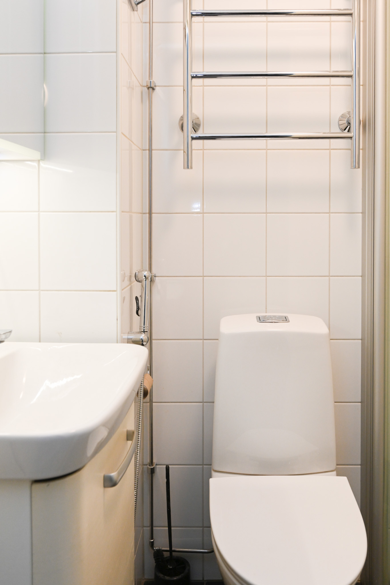 Kylpyhuone on siisti ja käytännöllinen. Asuntoon ei voi asentaa pyykinpesukonetta, mutta taloyhtiössä on hyvä ja toimiva pesutupa.