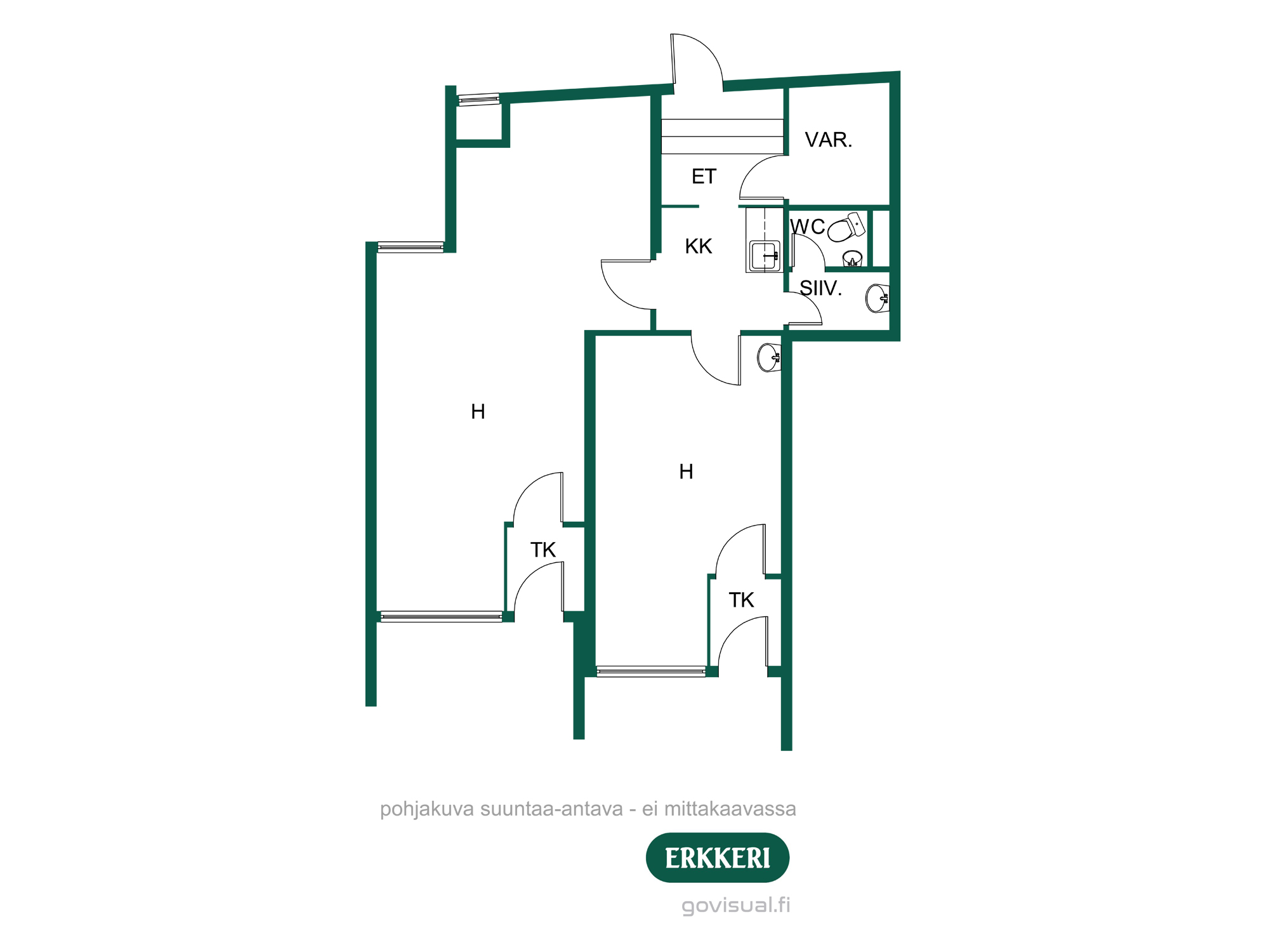 Toimistotila koostuu kahdesta huoneesta, minikeittiöstä sekä WC:stä.