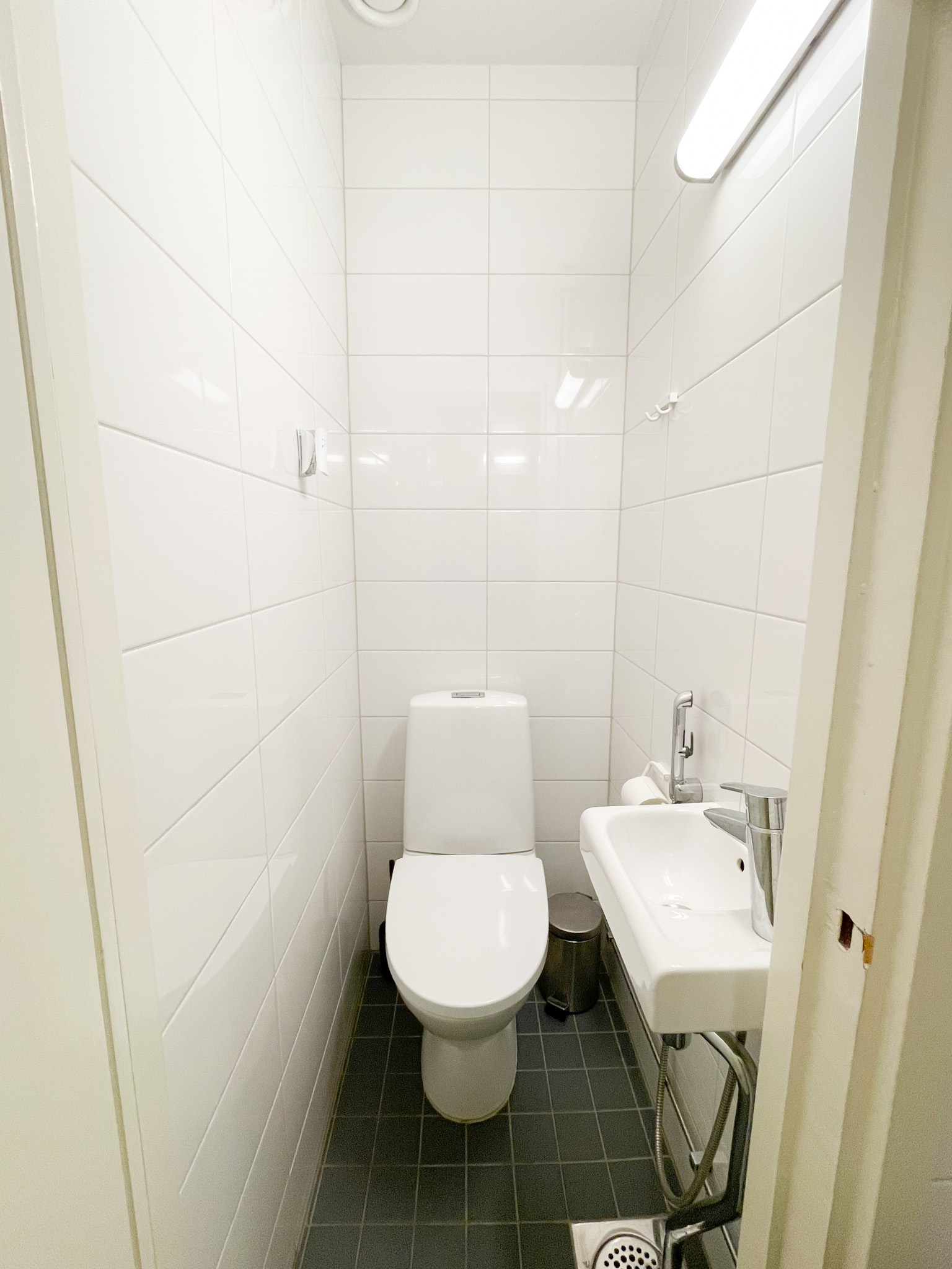 Tilassa on keittokomero ja WC, mikä tekee siitä käytännöllisen arjen tarpeisiin.