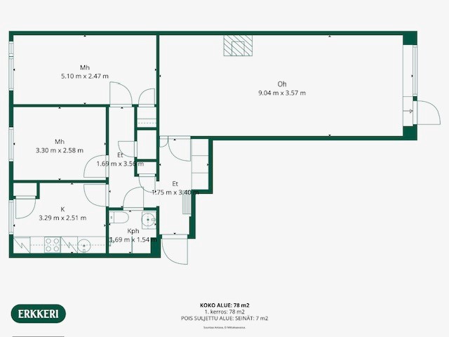 Keittiössä on runsaasti kaappi- ja työtilaa sekä astianpesukone, joka helpottaa päivittäistä arkea. Kaksi hyvänkokoista makuuhuonetta tarjoavat joustavasti mahdollisuuksia niin perheelle, työtilalle kuin tilavalle makuuhuoneelle.